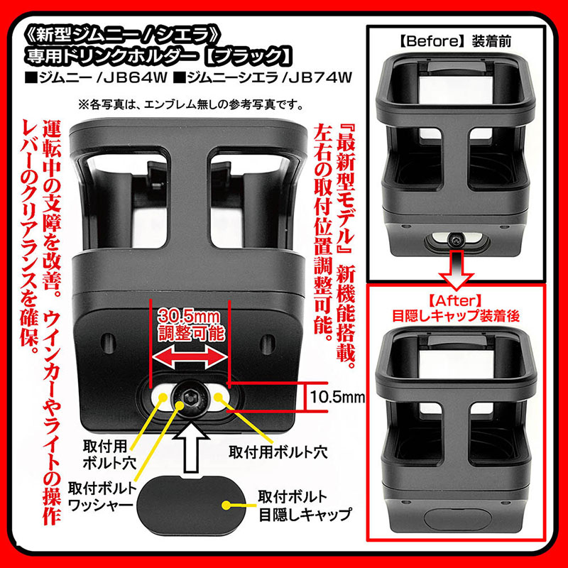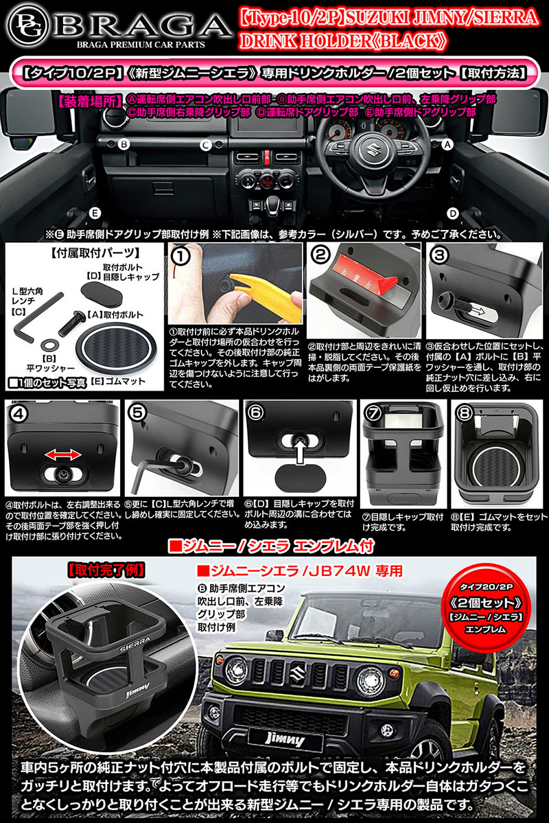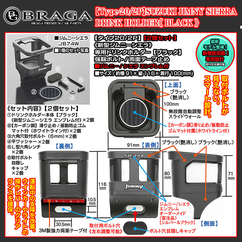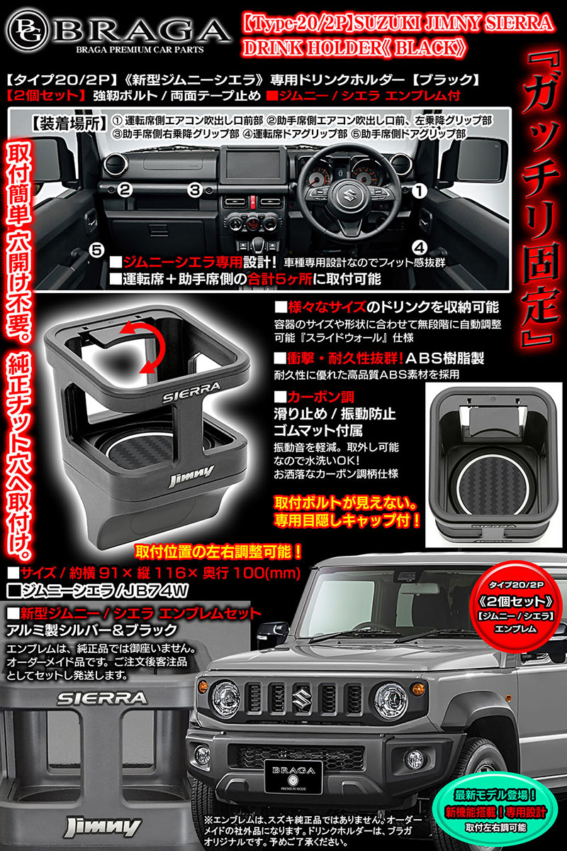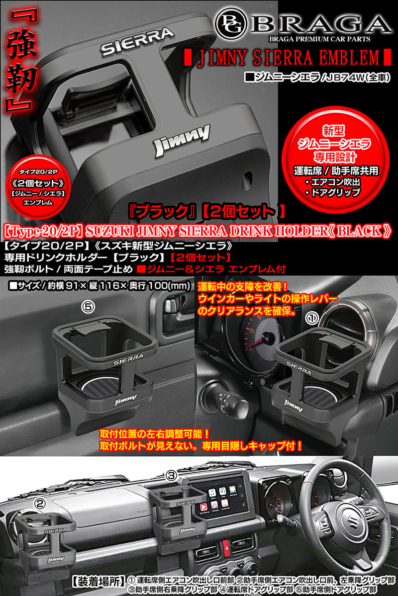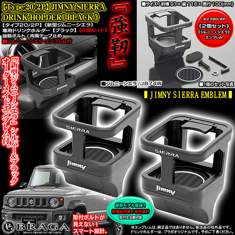 - 2個セット/新機能/新型ジムニー・シエラ エンブレム付/タイプ20/2P・ブラック/ジムニーシエラJB74W/ドリンクホルダー/客注/BG BRAGA
