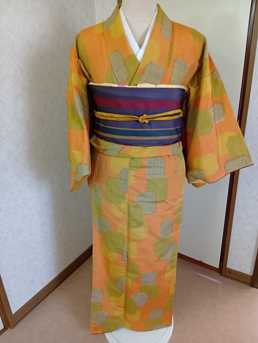 - 紬 袷 未使用 広衿 橙色 外出 観劇 かわいい町娘 インスタ映え