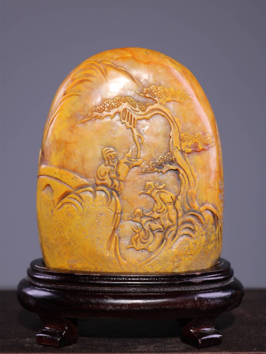 - 【仁】『寿山石・田黄石・細密彫・高士輪道紋印章・文房具・書道品』極細工 古賞物 中国古玩 古美術 古美味