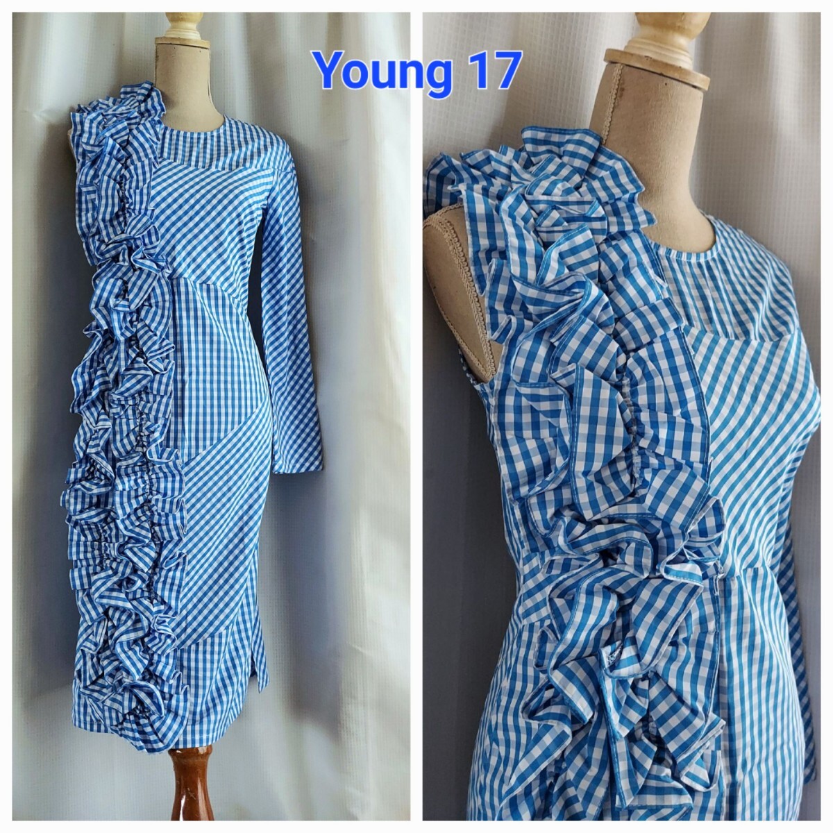 - 新品タグ付き インポート 縦フリルの片袖ワンピース ギンガム ブルー イレギュラーワンピース