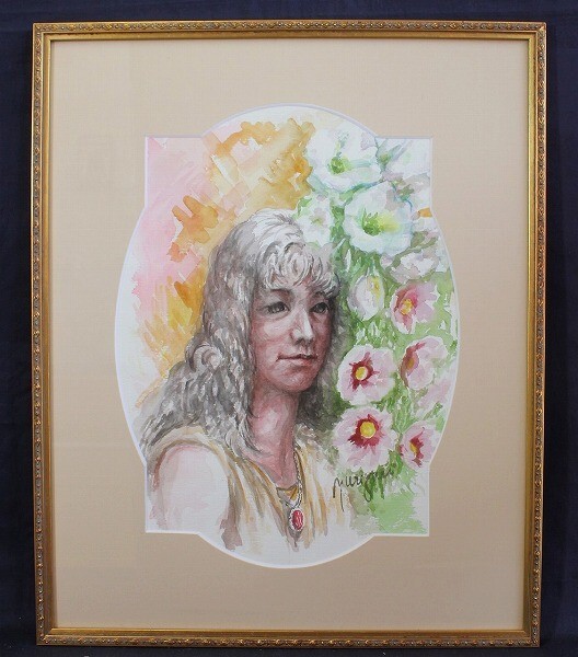 - 作者不詳 「女性像」 水彩 肉筆 額装/ガラス入 差し箱付 D545