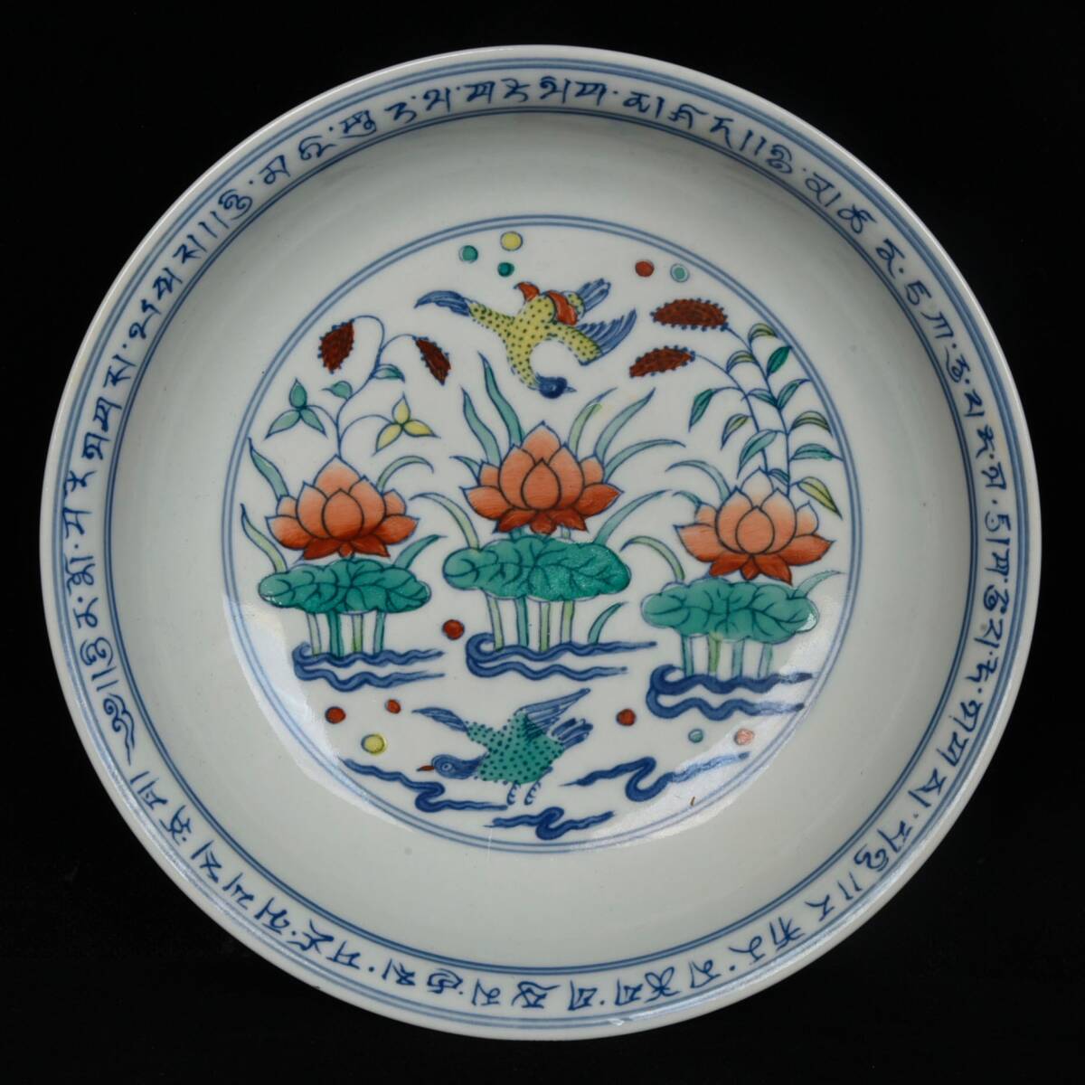 - 『館蔵珍品 明 成化年製款 古陶瓷品 斗彩 蓮池鴛鴦紋 供盤』置物 賞物 貴重物品 収蔵品 中国古美術