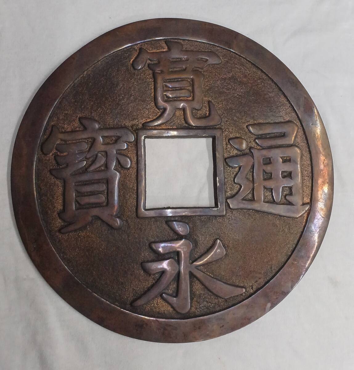 - 寛永通宝 古銭 縁起物 置き物 大型 金属製 直径29.8cm 中古 インテリア
