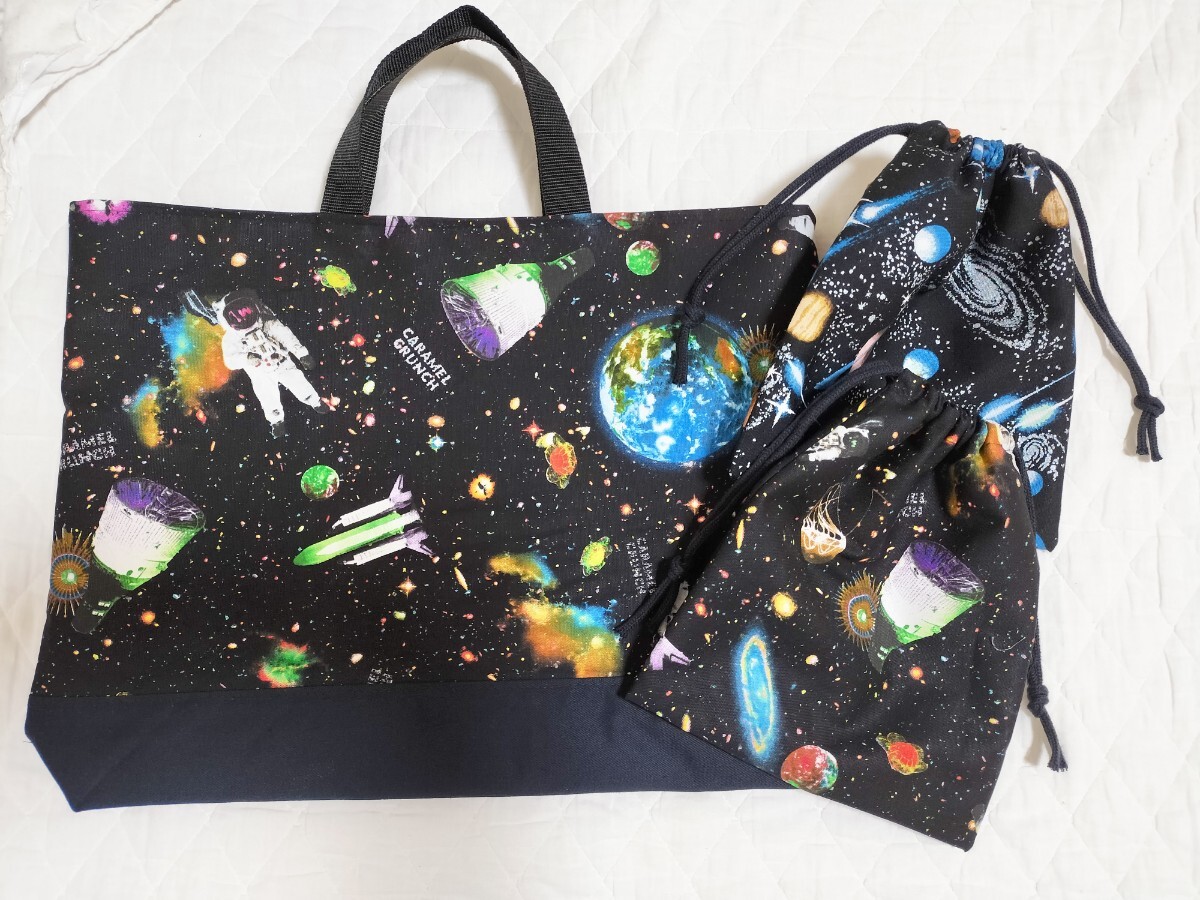 - 3点セット 宇宙柄 レッスンバッグ、巾着袋 ハンドメイド