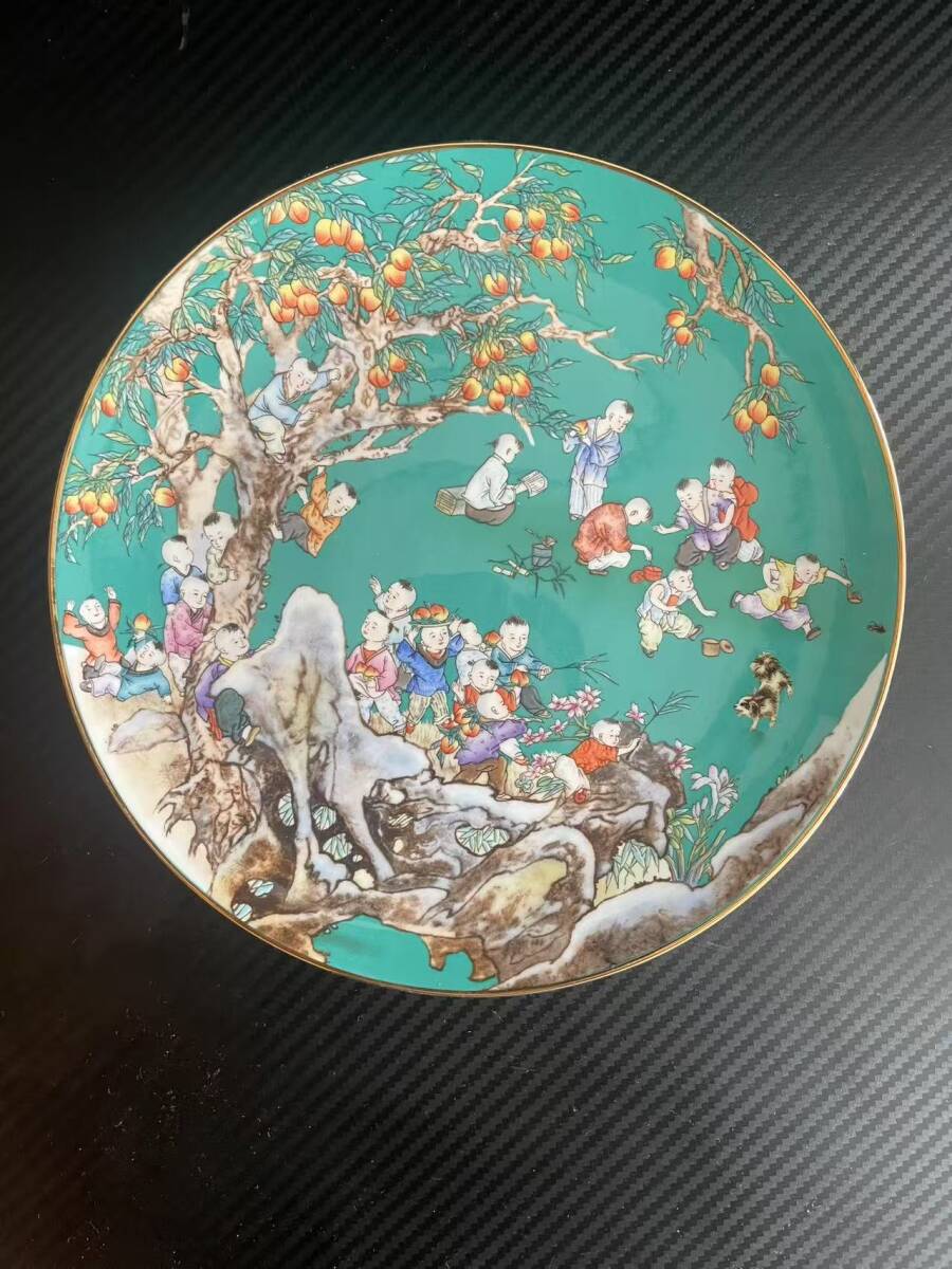 - 中国古芸術磁器,旧蔵粉彩陶芸,子供迎春彩飾皿,直径21cm,高さ2cm、グリーン