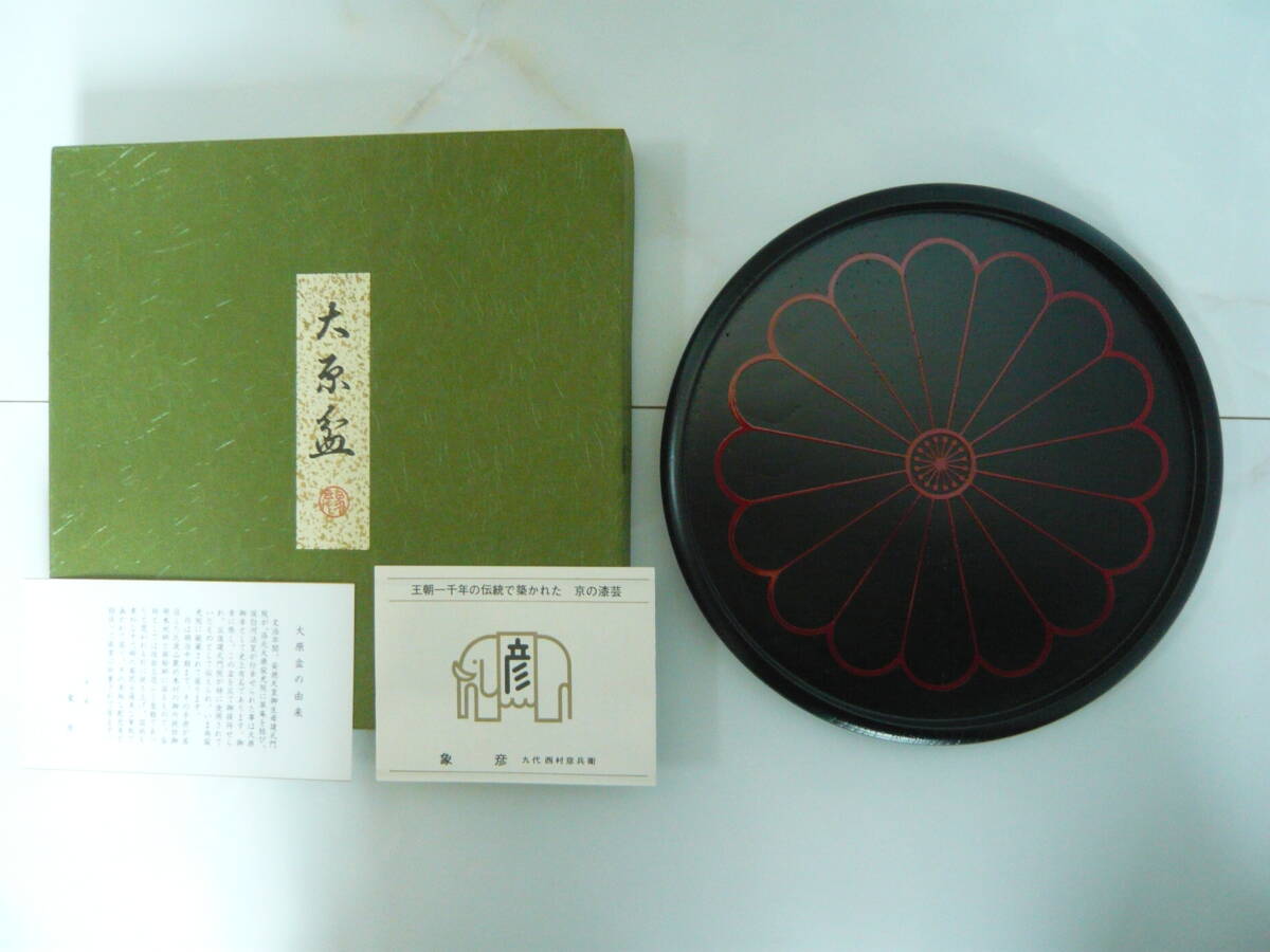 > 京の漆芸 大原盆 象彦 九代 西村彦兵衛 新品、未使用品 菊紋 黒塗り 丸盆 伝統工芸品 菓子盆 茶道具 茶事 漆器盆 和風