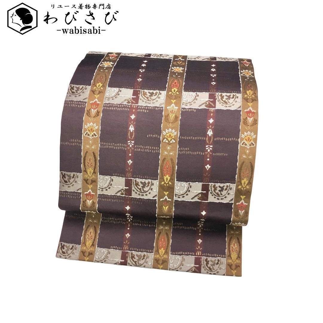 > 名古屋帯 西陣 木原織物 証紙付 格子柄に抽象花模様 紅消鼠色 O-5028