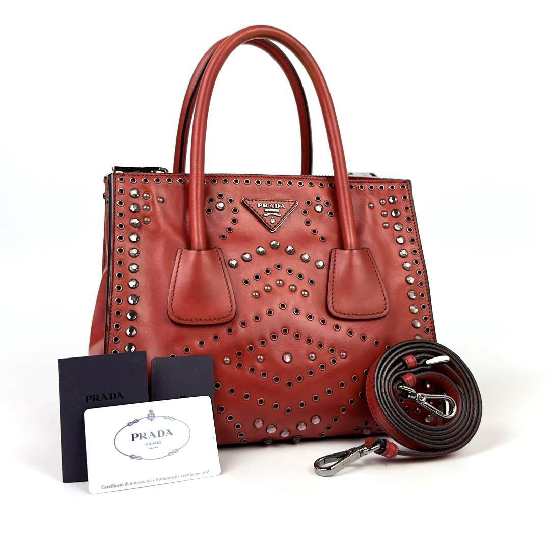 - 【美品】PRADA プラダ トートバッグ 2way ラインストーン スタッズ 三角ロゴプレート ショルダーバッグ レザー 赤色 レッド フォーマル