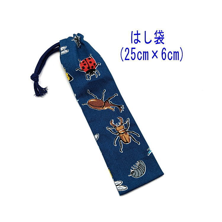 > はし袋・大(25cm×6cm)【昆虫柄 ネイビー】箸袋 箸入れ はし入れ マイ箸 細長巾着 給食 日本製 カブト虫 クワガタ トンボ カマキリ バッタ