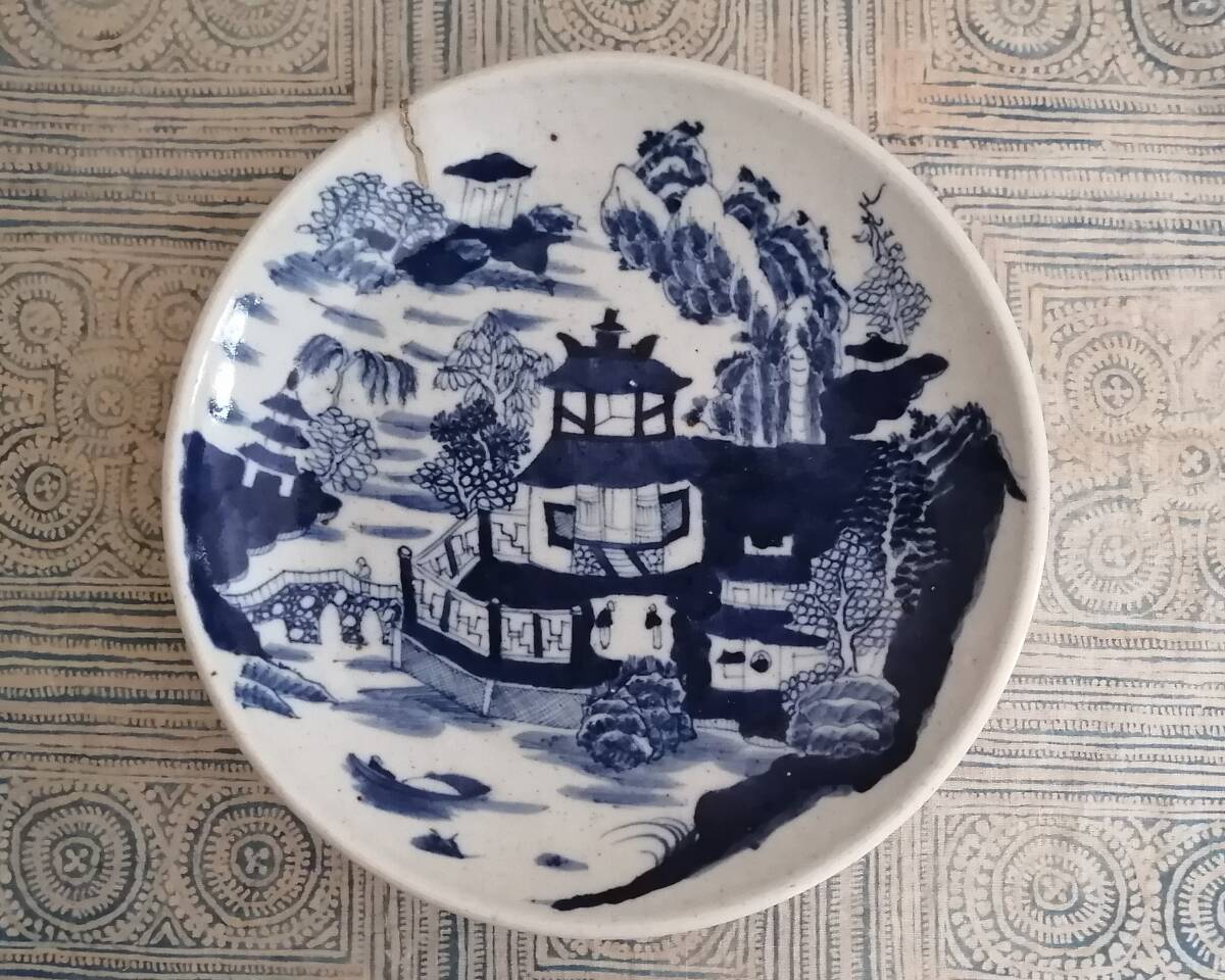 - 青花山水家屋紋中皿 池、家屋、橋、船、山谷の山水画