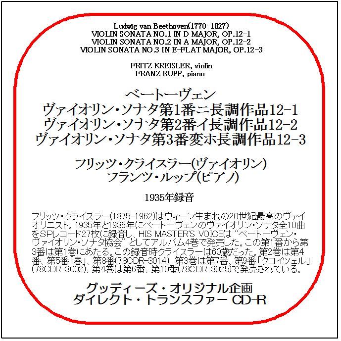 - ベートーヴェン:ヴァイオリン・ソナタ第1-3番/フリッツ・クライスラー/送料無料/ダイレクト・トランスファー CD-R