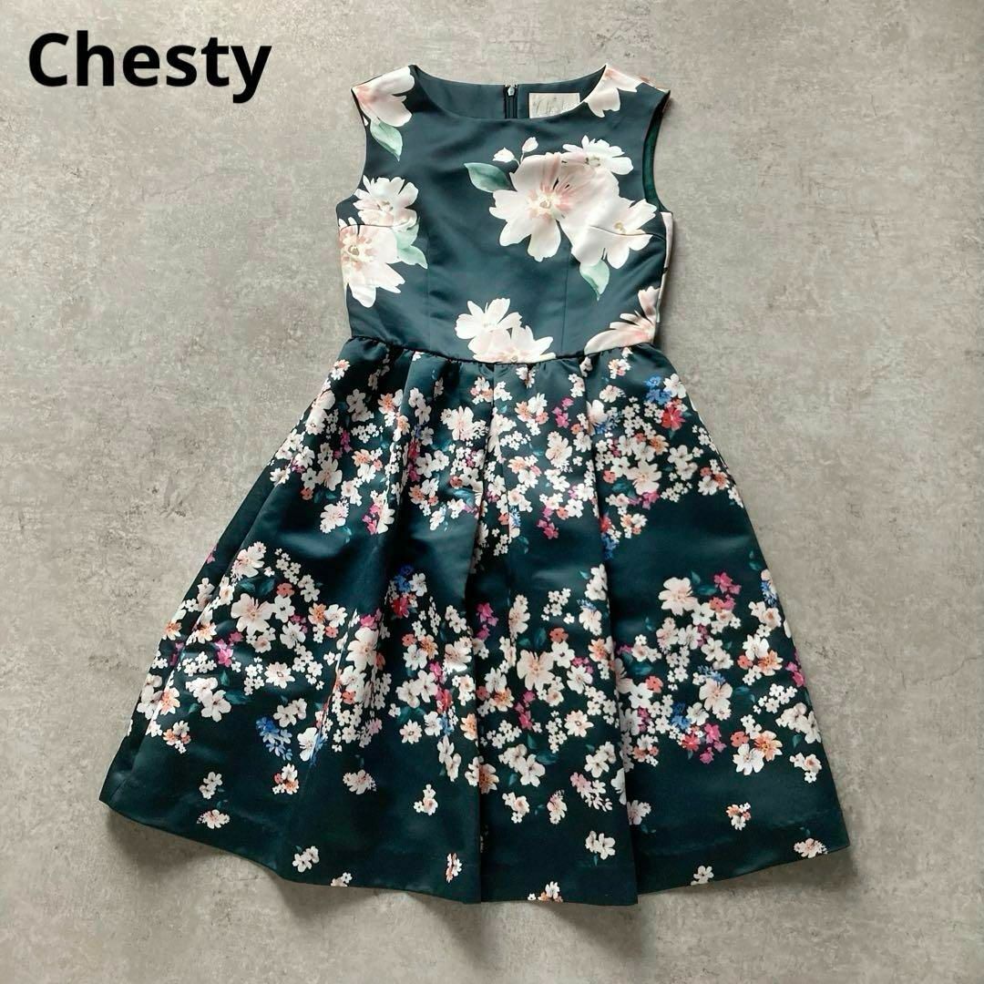 - チェスティ ノースリーブフレアワンピース Aライン ひざ丈 花柄 フラワープリント ダークグリーン 0サイズ Chesty
