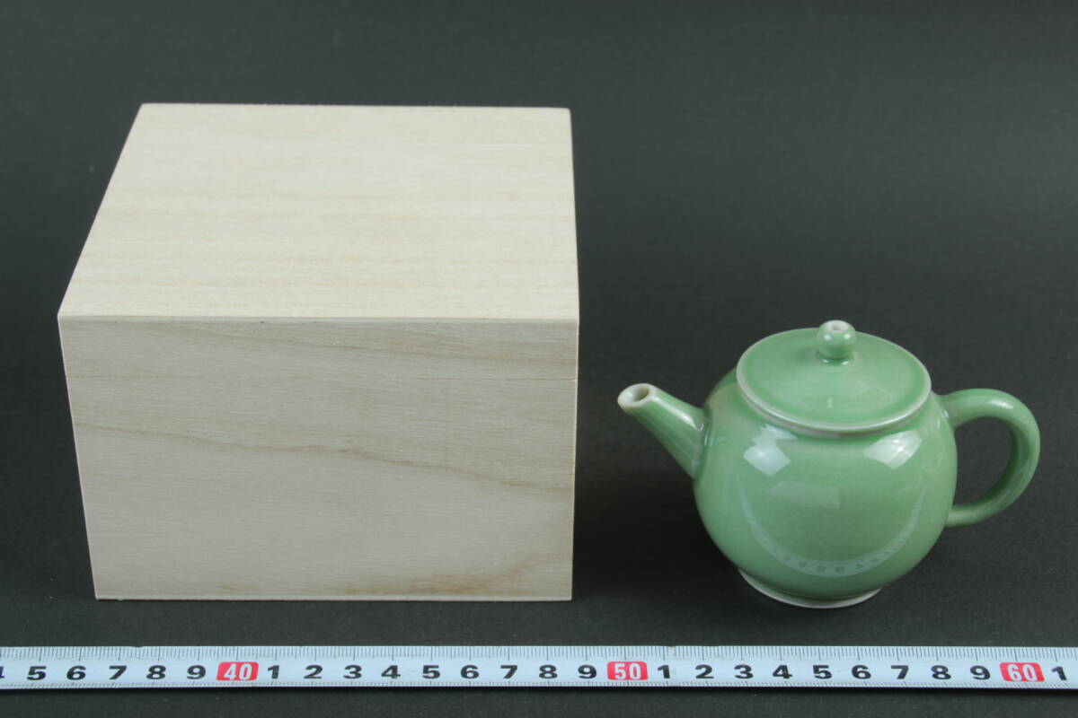- 7138 新品未使用 珍品 名工人気作家 平安春峰 青磁 茶注 宝瓶 玉露 急須 煎茶道具 布 栞 木箱