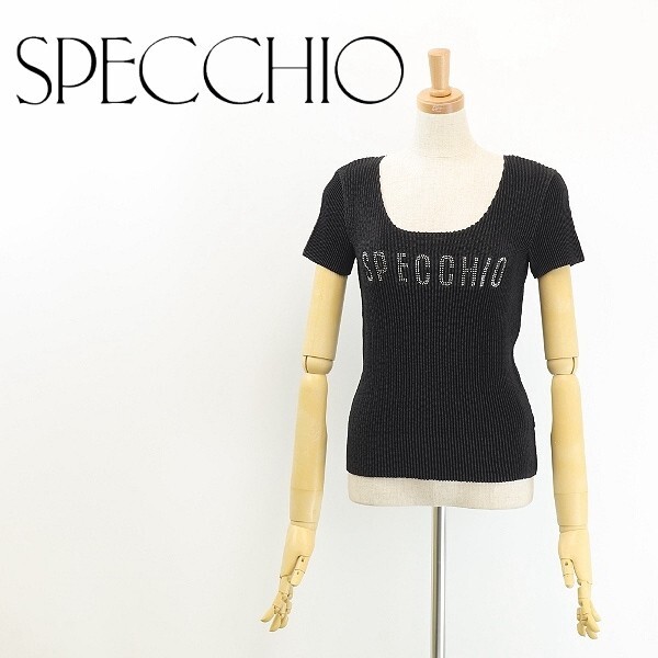 > ◆SPECCHIO スペッチオ プリーツ加工 ロゴ ラインストーン装飾 半袖 トップス カットソー 黒 ブラック 40