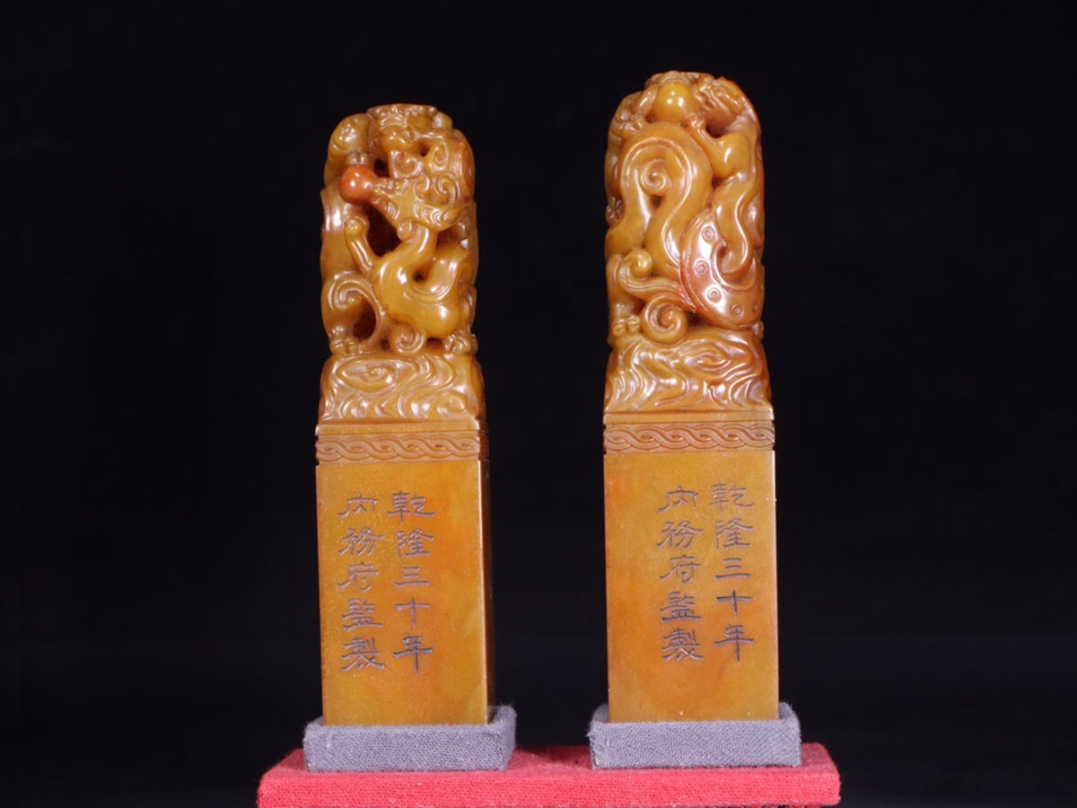 - 「清 乾隆三十年内務府監製 老寿山石 田黄石彫り 群魑献寶鈕印章擺件一対」極細工 擺件 古賞物 中国古美術 旧蔵出