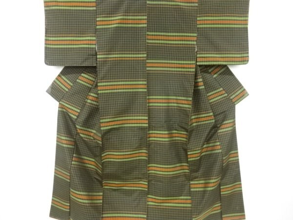 > ys7377001; 宗sou 格子に横段模様織り出し米沢紬着物・道中着アンサンブル【着】