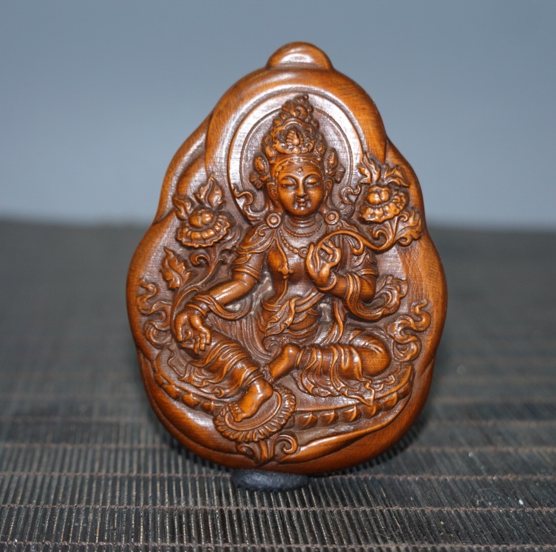 - 蔵友旧蔵出 黄楊木製 細密彫 雙面綠度母紋 令牌 置物 古賞物 稀少珍藏品 中国時代美術品