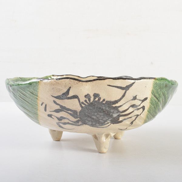 - 本物保証 北大路魯山人 織部 蟹絵 三足鉢 共布共箱 本物返品OK 242
