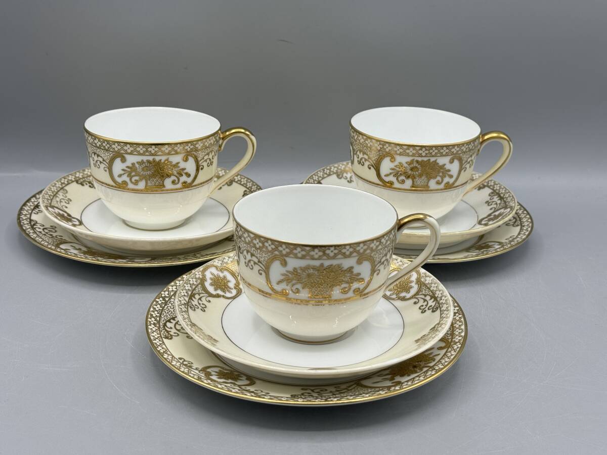 - 里帰り ノリタケ フラワーバスケット 3客 トリオ カップアンドソーサー ケーキ 皿 プレート 金彩 お花 マルキ印 カップ&ソーサー (#-6-D)
