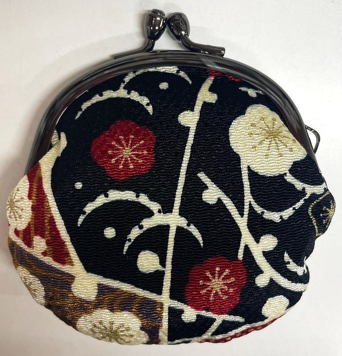 - 日本製 がま口小銭入れ 2.5丸 縮緬古裂 ちりめん 梅 花柄 黒