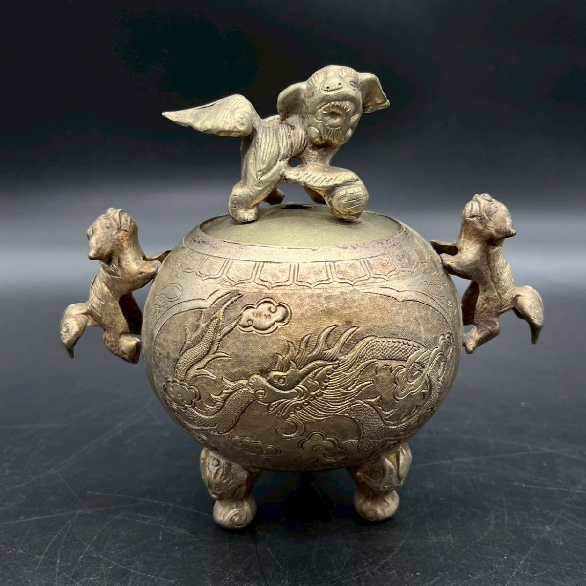 > SW0424-26-3 現状品 中国 獅子 銅 香炉 置物 工芸品 古美術品 古銅彫 高さ15㎝ 口径6㎝ 60サイズ