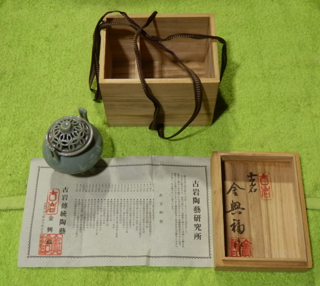 - 古岩 金興福 高麗 青磁 三足 香炉 鶴 透かし彫り 韓国