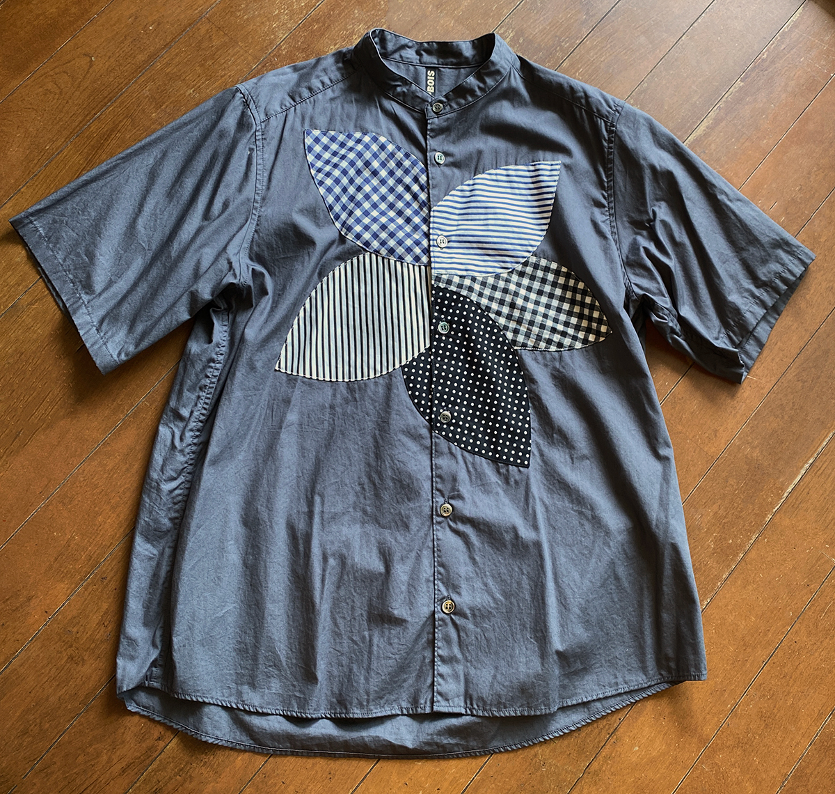 > FRAPBOIS フラボア パッチフラシャツ 半袖 ブラウス 花柄 パッチワーク スタンドカラー バンドカラー グレー 日本製 ユニセックス