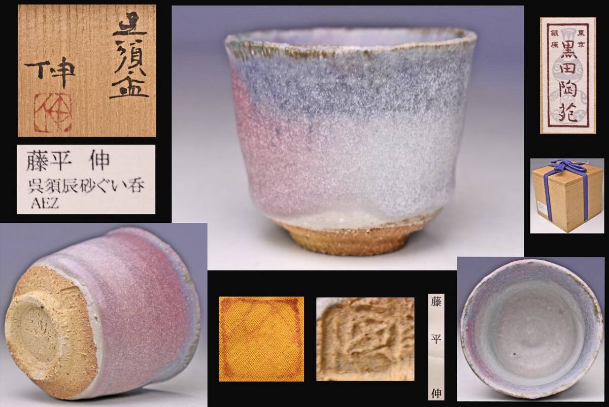 > 藤平伸 ★ 呉須 ぐい呑 ★ 共箱 共布 栞 ★ 淡い呉須と辰砂のコントラストが美しい希少な逸品 ★ 酒器 杯 盃 ★ 実子: 藤平寧