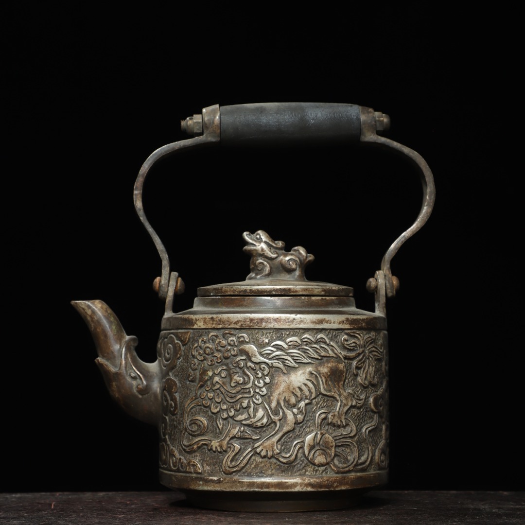 - 民国時期 民国三年 古銅塗銀 麒麟紋 提梁壺 急須 煎茶道具 極細工 置物擺件 古美術品 時代物 古董品 収集 旧家蔵出 中国唐物