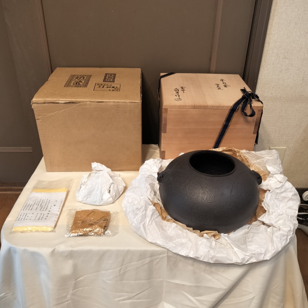 - K05121 ◆釜師 佐藤清光 清光作 海老鐶 海老付 平丸釜 炉釜 茶器 茶道具 共箱 元箱付き 未使用品◆