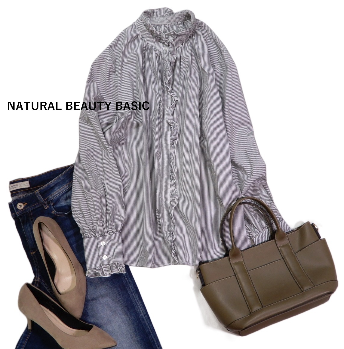 - ナチュラルビューティーベーシック NATURAL BEAUTY BASIC 大人可愛い☆ ストライプ ハイネック フリル シャツ ブラウス M