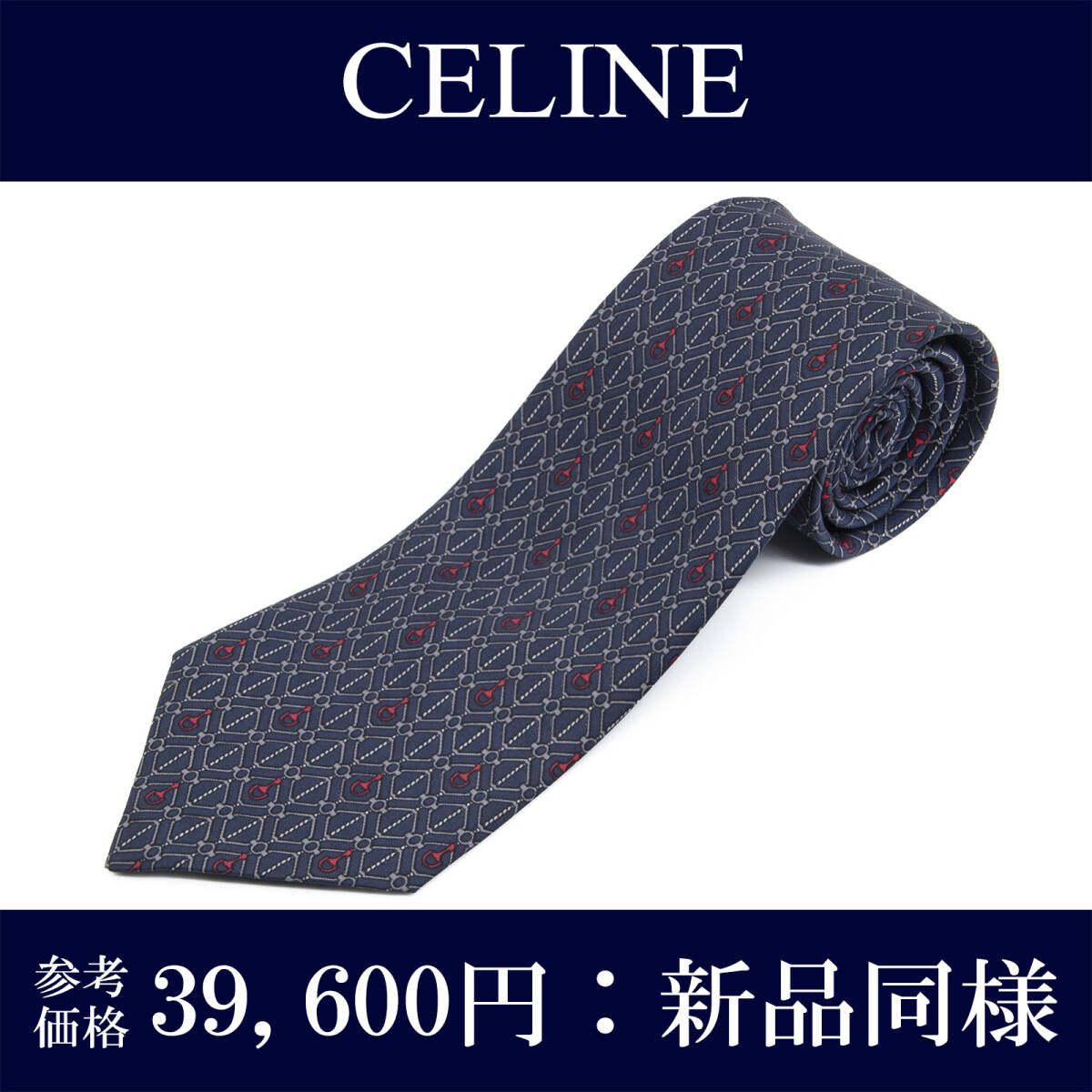 > 送料無料 セリーヌ ネクタイ レギュラータイ 新品同様 シルク ネイビーブルー グレー 赤 白 ホースビット スクエア スペイン製 綺麗 N696