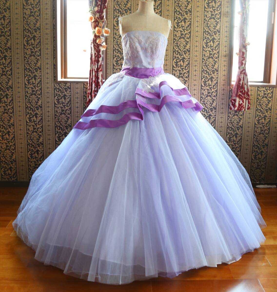 - 淡いパープル系の美しい高級ウエディングドレス9号11号M~Lサイズ編上げ調節可能カラードレス紫