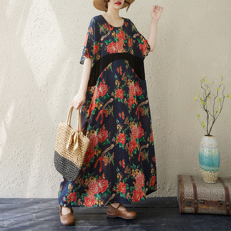 - 新入荷*ワンピース レディース 大きいサイズ マキシワンピース ゆったり プリント柄 切り替え 配色 体型カバー 半袖 ロングワンピース*5@