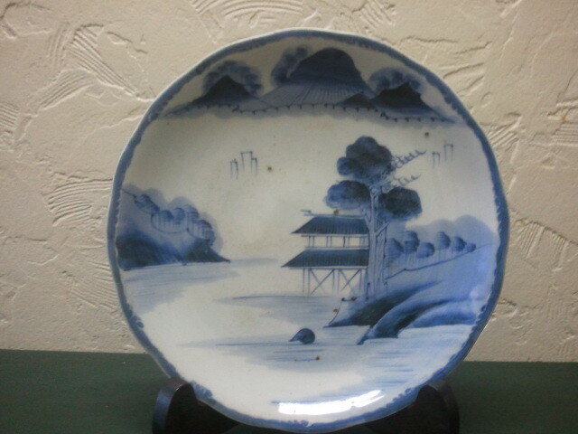 > ☆☆【美術 陶磁器・インテリア】有田焼 染付 山水楼閣図 大皿/目跡 古物 骨董 古民具 インテリア 飾皿 直径 28.5㎝ 九寸皿