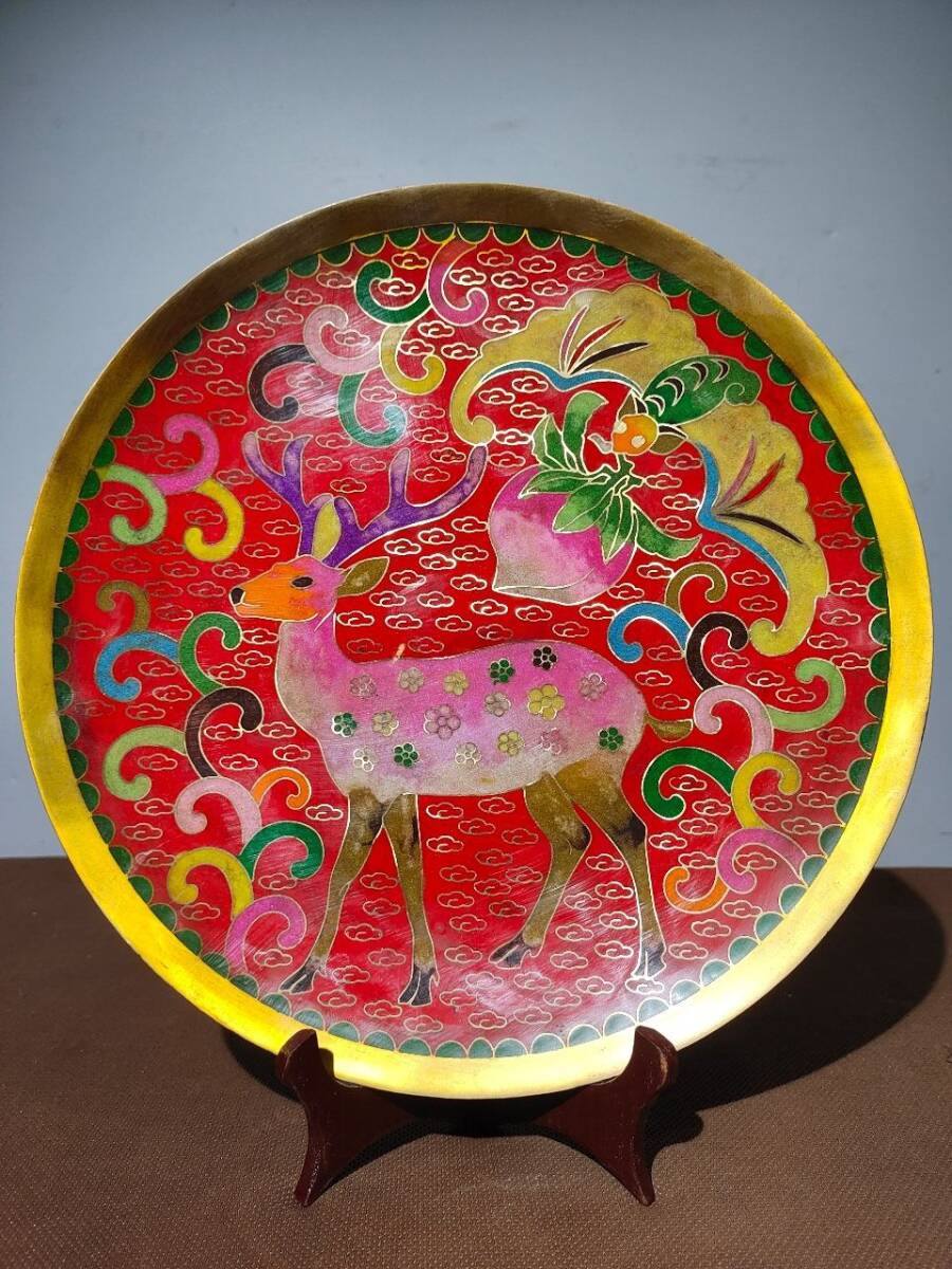 - 蔵友旧蔵出 銅製 景泰藍 琺瑯彩 福祿雙全紋 賞盤 貴重品 置物 古賞物 中国古玩 中国古美術品