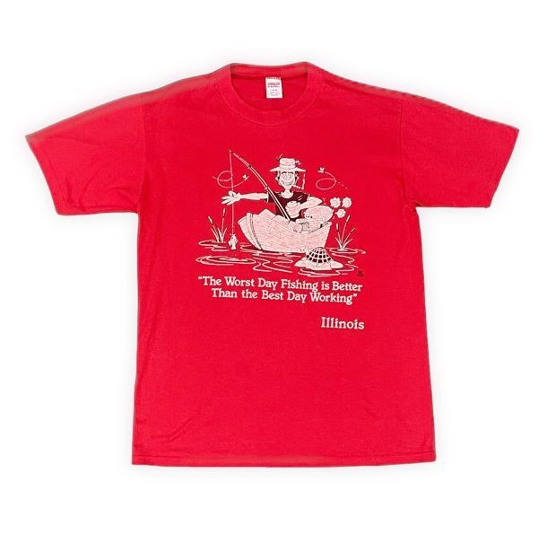 - 80's 米国製 ジャージース ラッセル JERZEES BY RUSSELL ビンテージ Tシャツ イリノイ 釣 フィッシング 赤 L [la-1208]