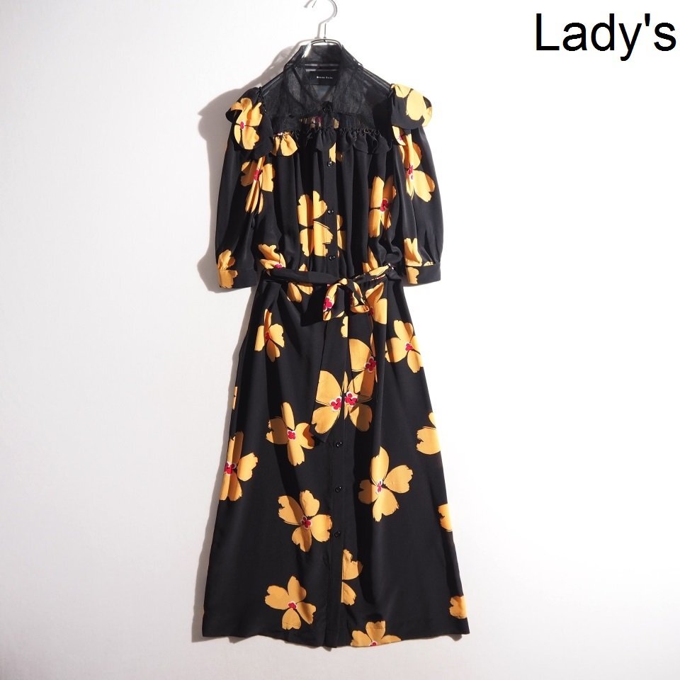 - P2883P ▼Simone Rocha シモーネロシャ▼ チュール切替え フラワープリント シルク ハーフスリーブ ワンピース ブラック UK8 春夏 rb mks