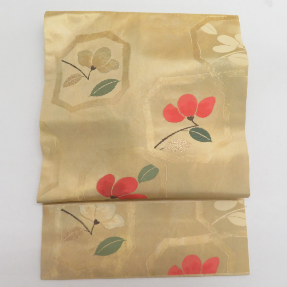 - 西陣織 名古屋帯 長谷川織物 落款入り 正絹 ゴールドx赤x緑 花模様 六通柄 仕立て上がり 着物帯 長さ350cm
