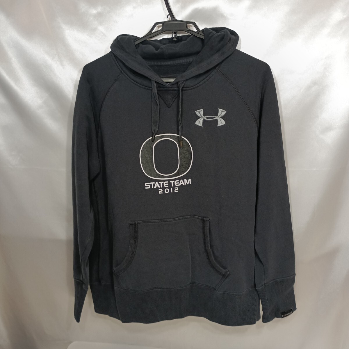 > 134♪USユーズド★UNDER ARMOUR(アンダーアーマー)プリントビッグロゴプルオーバーブラックMサイズ(着用感Lサイズ)
