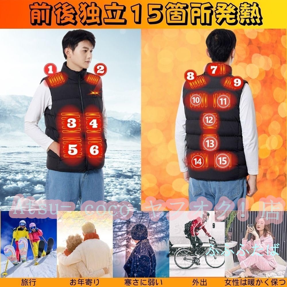 - 電熱ベスト 加熱服 USB給電 電熱ジャケット 【前後15箇所発熱 30000mAhモバイルバッテリー付属 】充電式ヒート前後独立 3段階温度調整