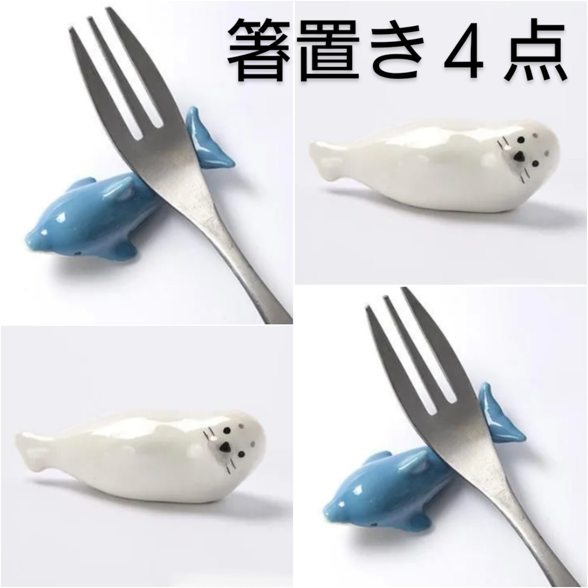 - 新品 箸置き イルカ アザラシ いるか あざらし アシカ あしか 4点セット はしおき 陶器製 海の生き物 キッチングッズ 海 動物 白 ブルー 青