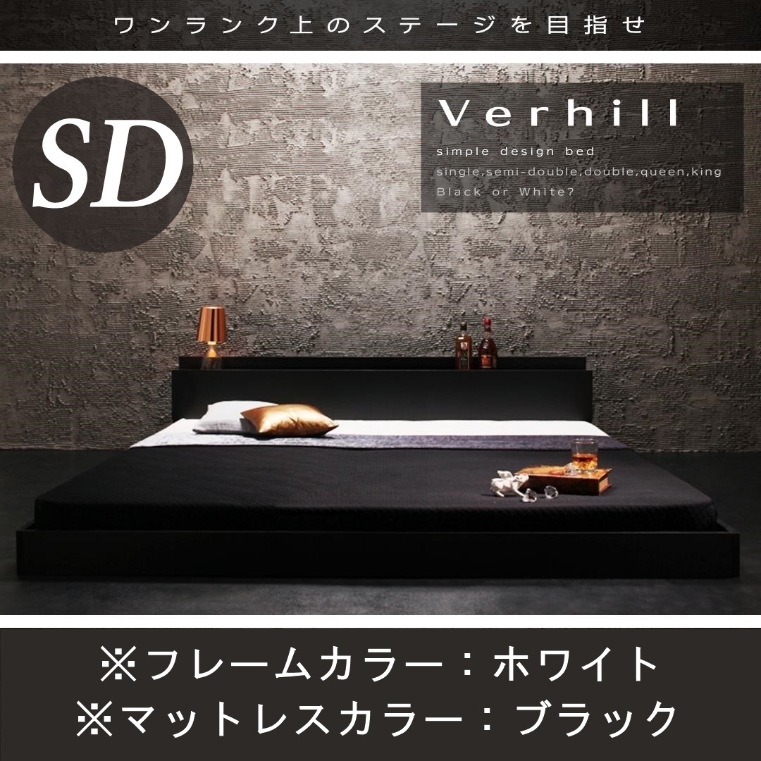 > 棚・コンセント付きフロアベッド Verhill ヴェーヒル スタンダードボンネルコイルマットレス付き セミダブル ホワイト×ブラック