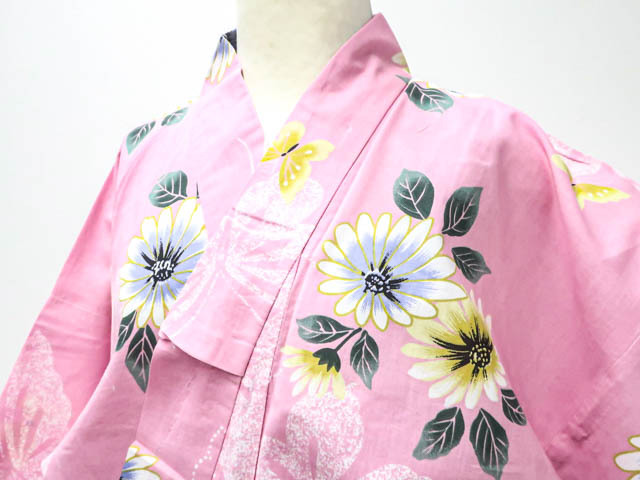 - 《古美術京松》【着物】昭和レトロ 浴衣 花・蝶文様 身丈約159.5cm 裄丈約64.5cm r7z05-519