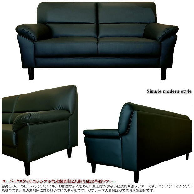 - ローバックスタイルのシンプルな木製脚付2人掛合成皮革張ソファー ブラック PVCレザー 肘付 スタンダードモダン カジュアル コンパクト