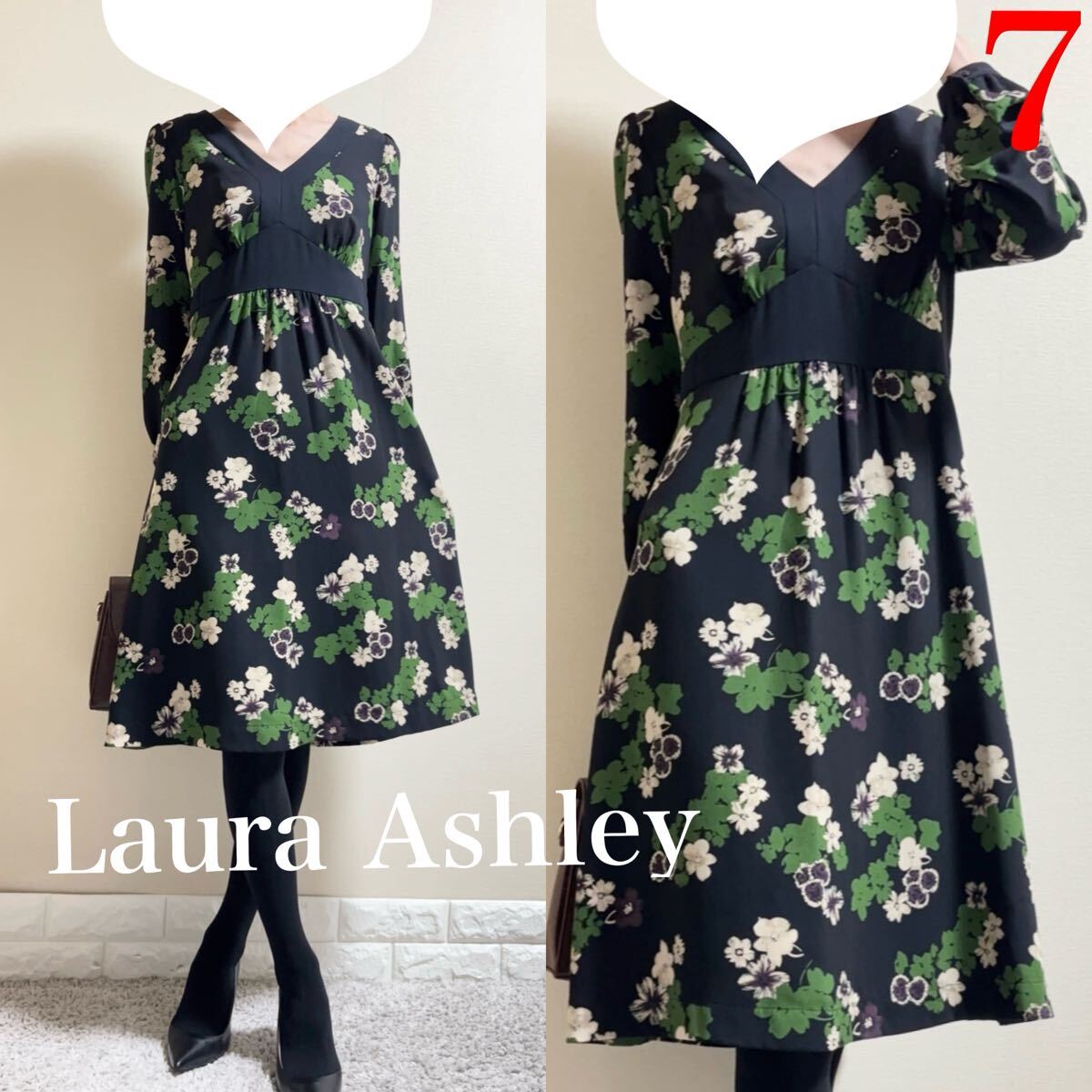 > 美品!Laura Ashley ローラアシュレイ 花柄 長袖 ワンピース 7 SM 黒 フラワー オケージョン ジョーゼット ブラック パフスリーブ