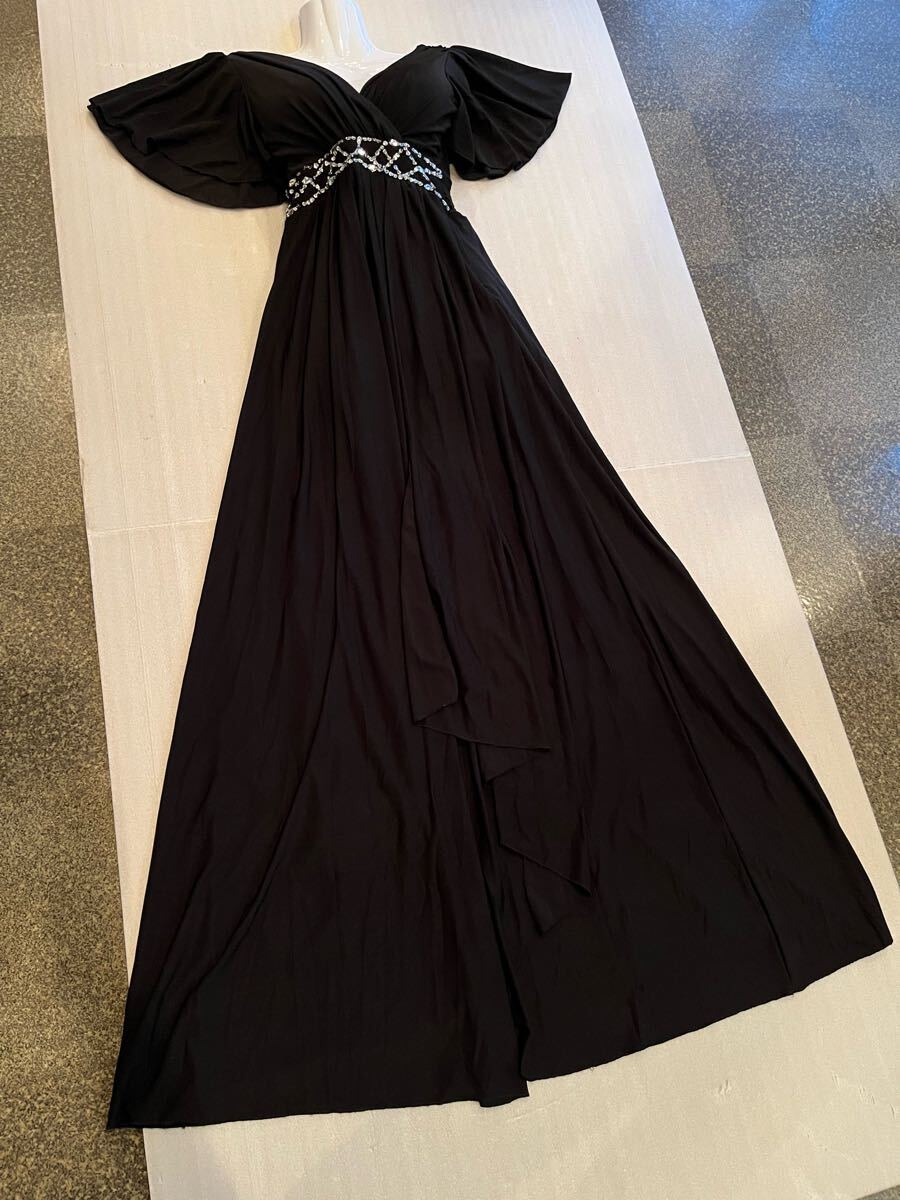 - 厚手/美品◆発表会/演奏会/司会/パーティ/舞台/撮影/お仕事◆黒+スパン/ビジュー◆ドレープロングドレス◆袖付き
