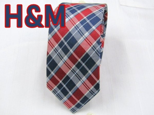 - 【ナロー細身ネクタイ】【エイチアンドエム】 E 481 エイチアンドエム H & M ネクタイ 紺系 赤系 チェック ジャガード ナロータイ