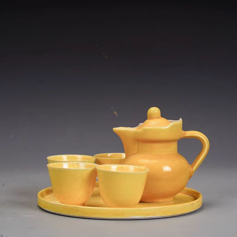 > 明時代 成化年製款 古陶磁器 黄釉 茶壺 茶杯 杯子 茶道具 一套 文案置物 擺件 時代物 古董品 骨董 旧家蔵出 唐物 中国古玩 古美術品