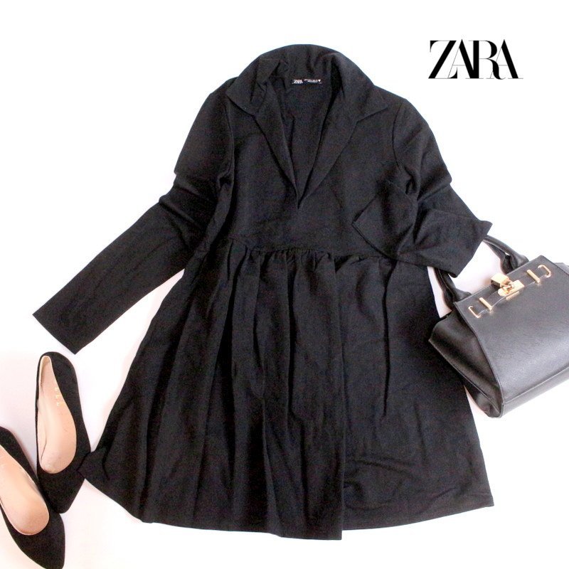 > 美品 ZARA ザラ ■ 春 ジャージ― 襟あり ティアードワンピース シャツワンピース 膝上丈 可愛い S ブラック 黒 ほんのり艶 ふんわり